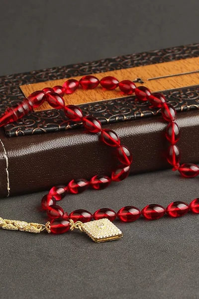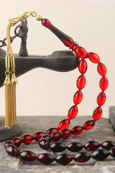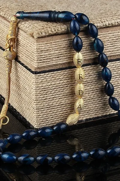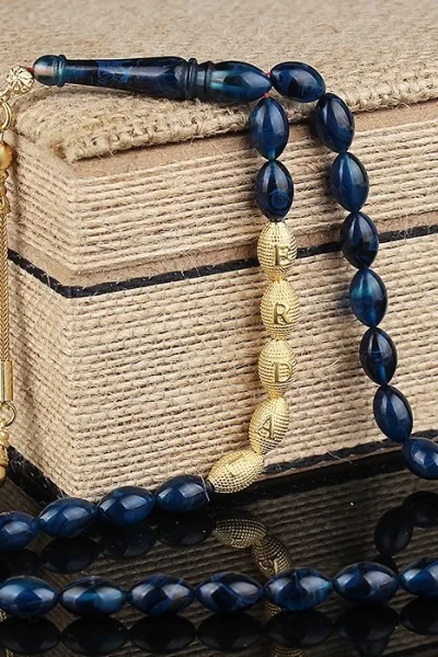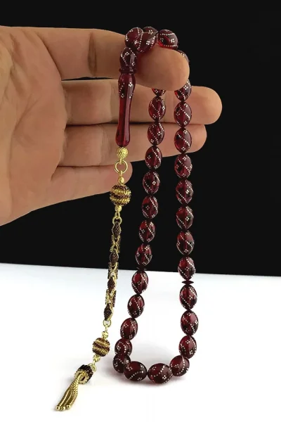 Altın Kaplama Gümüş Kazaz Püskül ve İsim yazılı Sıkma Kehribar Tesbih