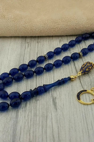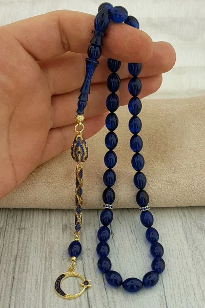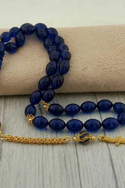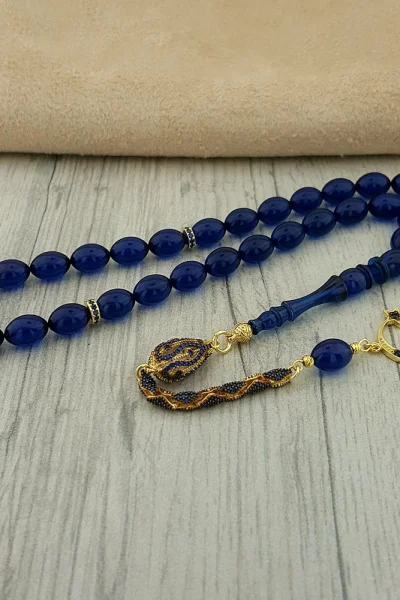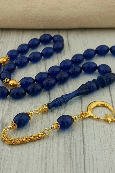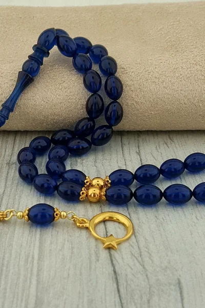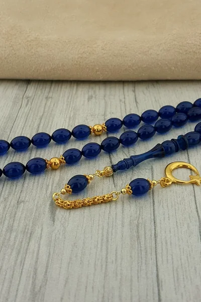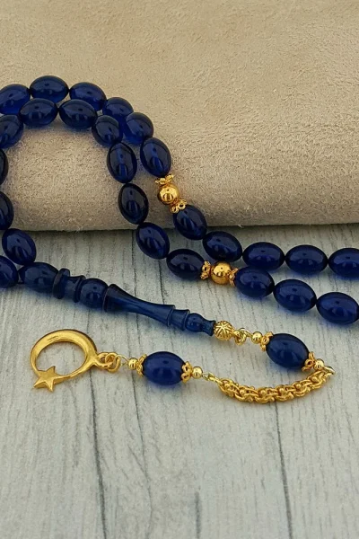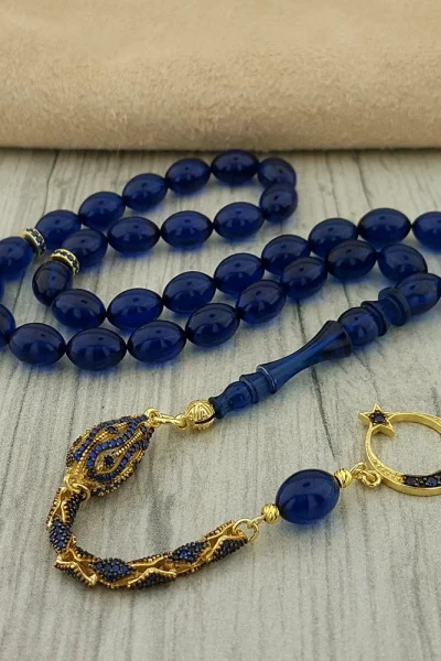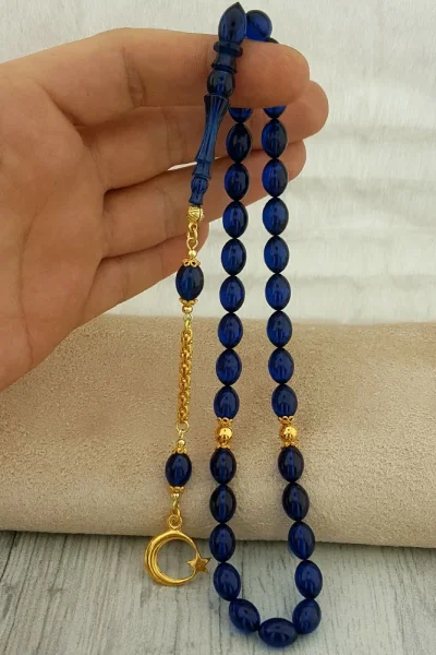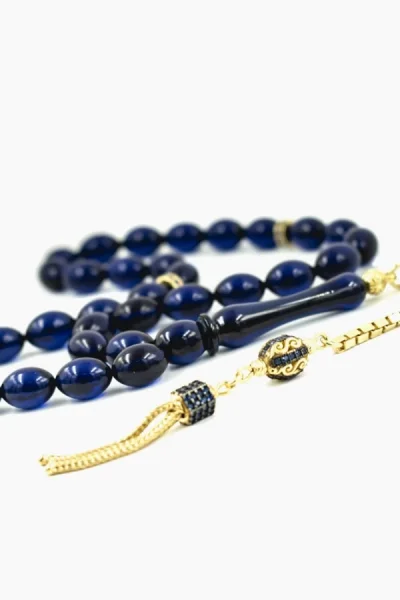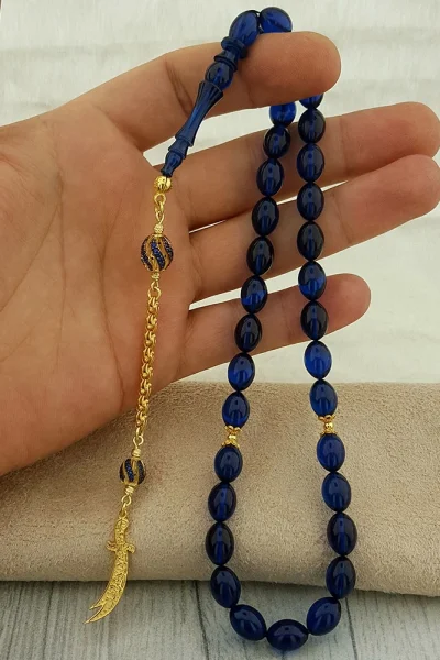 ALTIN KAPLAMA GÜMÜŞ PÜSKÜLLÜ PARLAMENT MAVİSİ ATEŞ KEHRİBAR TESBİH