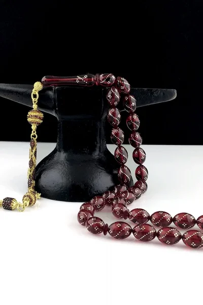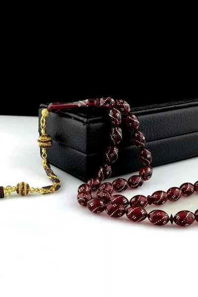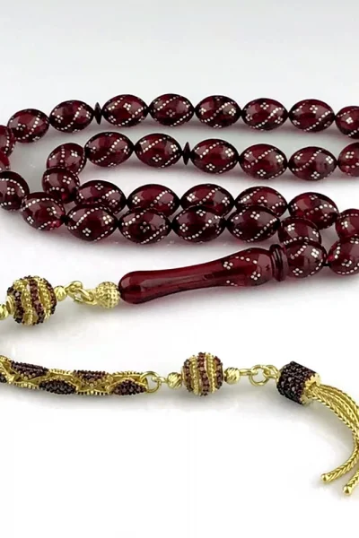 ALTIN KAPLAMA ZİRKON TAŞ PÜSKÜLLÜ GÜMÜŞ İŞLEMELİ ATEŞ KEHRİBAR TESBİH