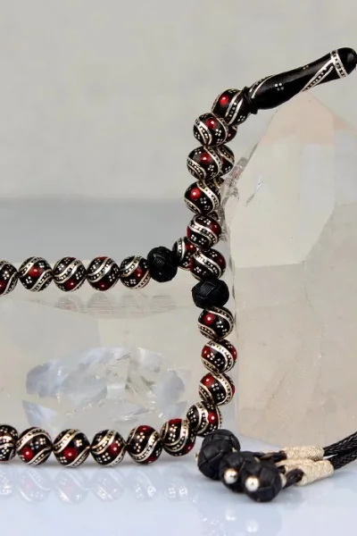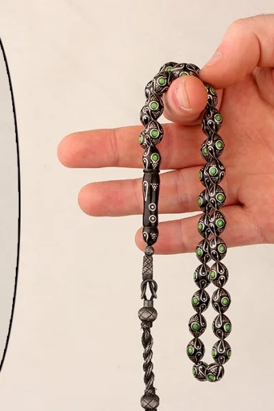 1000 Ayar Kazaz Püsküllü Mine ve Gümüş İşlemeli Erzurum Oltu Taşı Tesbih