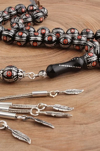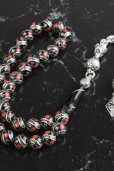 Gümüş Ve Mine İşlemeli Büyük Boy Oltu Taşı Tesbih