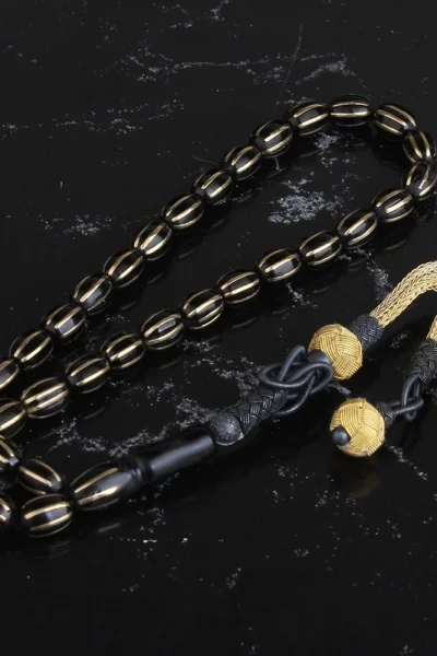 Erzurum Oltu Taşı Tesbih Yoğun Gümüş İşlemeli Arpa Kesim Tesbih
