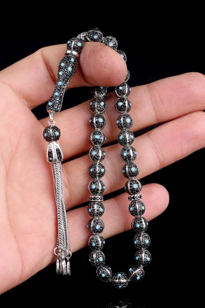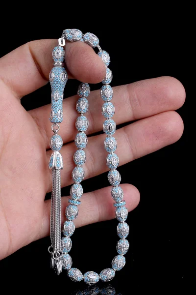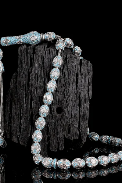 TURKUAZ ZİRKON TAŞ İŞLEMELİ TAMAMI 925 AYAR GÜMÜŞ TESBİH