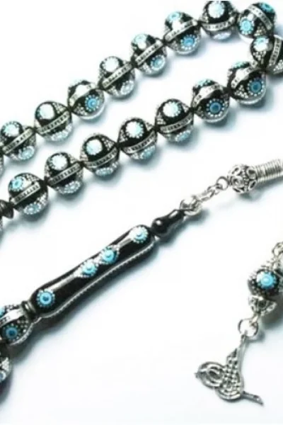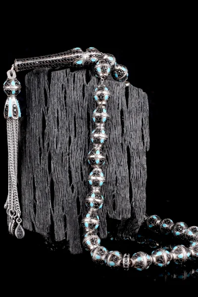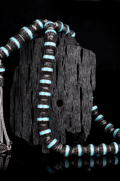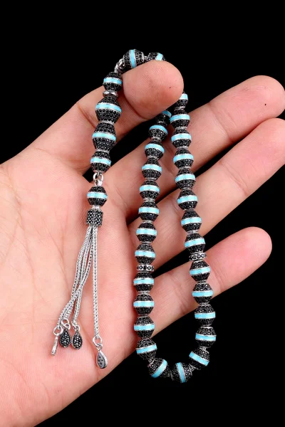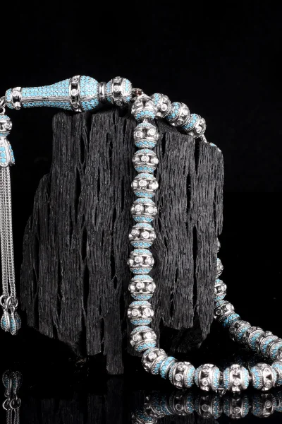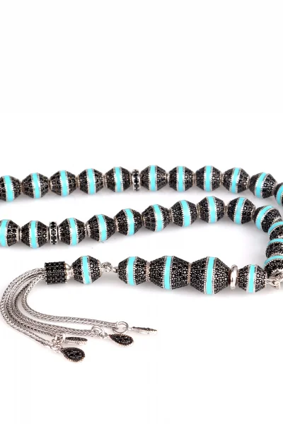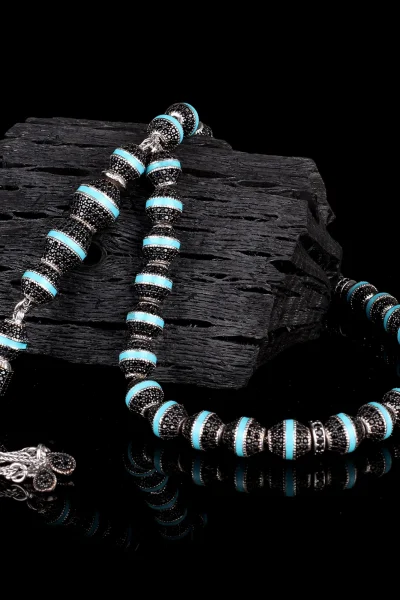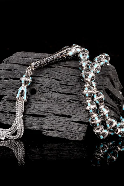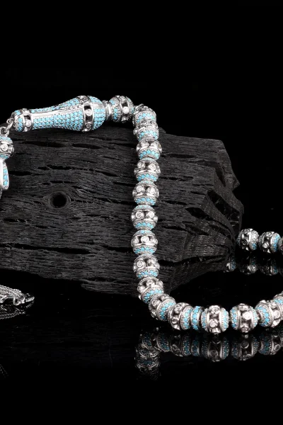 TURKUAZ MİNELİ ZİRKON TAŞ İŞLEMELİ TAMAMI 925 AYAR GÜMÜŞ TESBİH