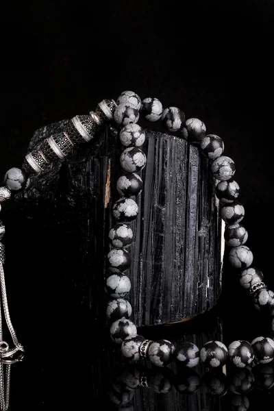 Zirkon Taşlı Gümüş Püsküllü Karlı Obsidyen Taşı Tesbih