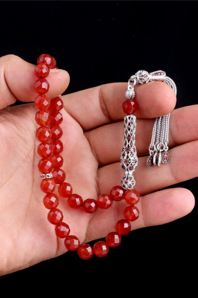 Zirkon Taşlı Gümüş Püsküllü Kristal Kesme Akik Taşı Tesbih