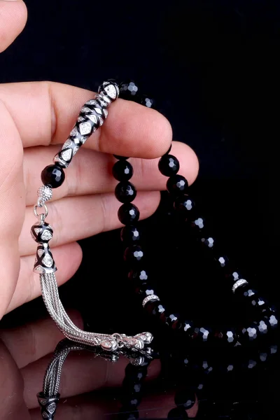 Zirkon Taşlı Gümüş Püsküllü Kristal Kesme Onix Taşı Tesbih