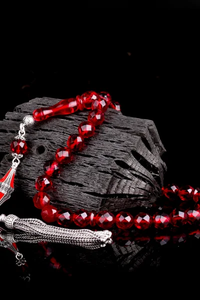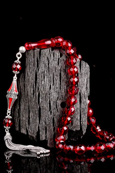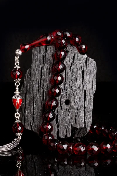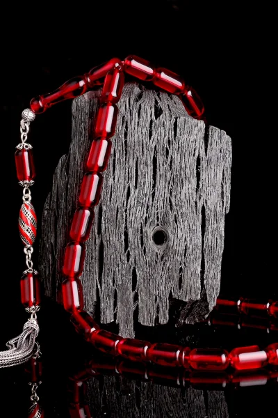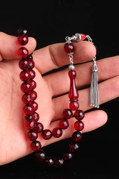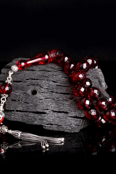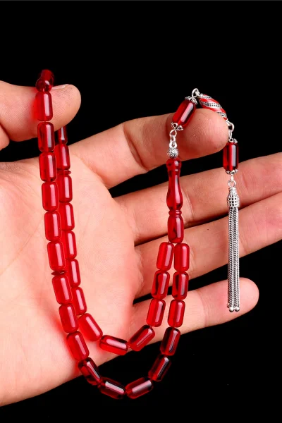 Kırmızı Renk Faset Kesim Gümüş Püsküllü Damla Kehribar Tesbih