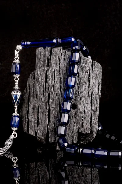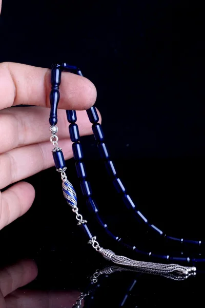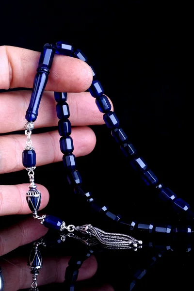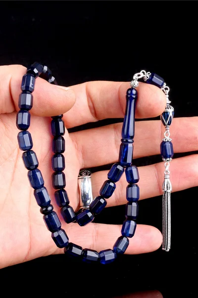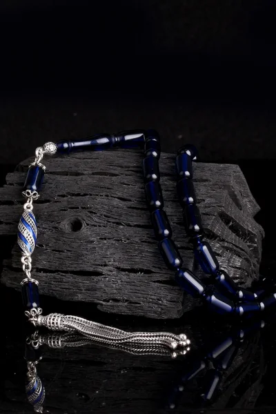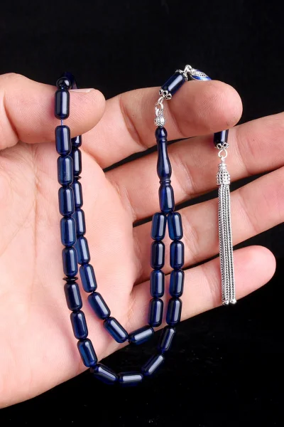 925 Ayar Gümüş Püsküllü Kapsül Kesim Mavi Renk Damla Kehribar Tesbih