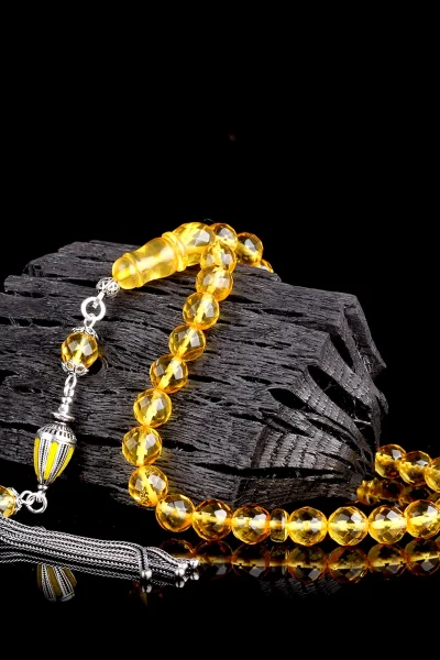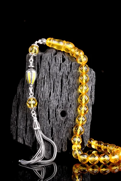 Mineli Gümüş Püsküllü Faset Kesim Damla Kehribar Tesbih