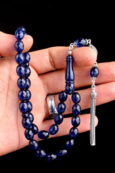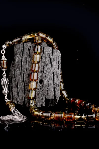 Çift Renk Gümüş Püsküllü Fasetli Damla Kehribar Tesbih