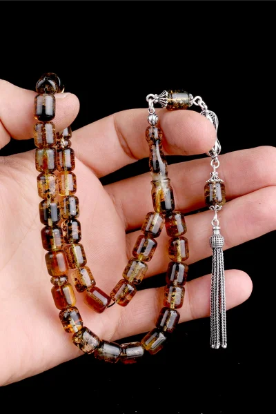 925 Ayar Gümüş Kral Zincir Püsküllü Kapsül Kesim Sıkma Kehribar Tesbih