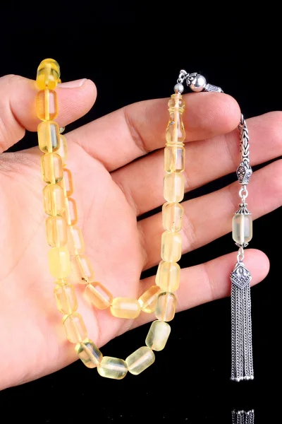 925 Ayar Gümüş Püsküllü Kapsül Kesim Şeffaf Renk Damla Kehribar Tesbih