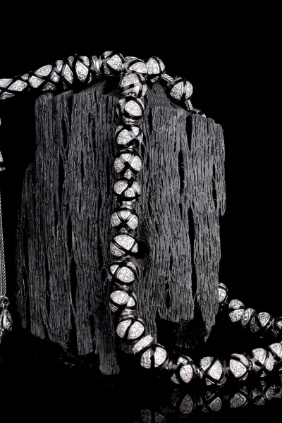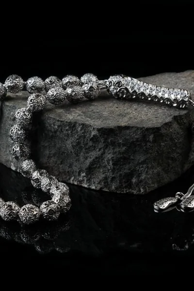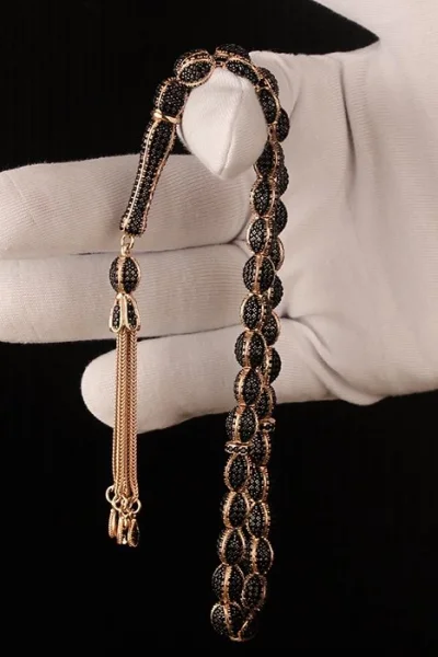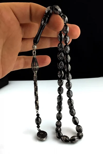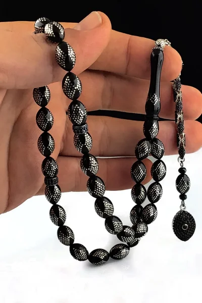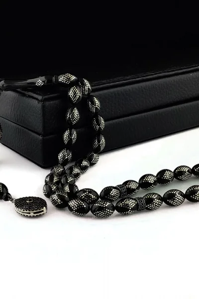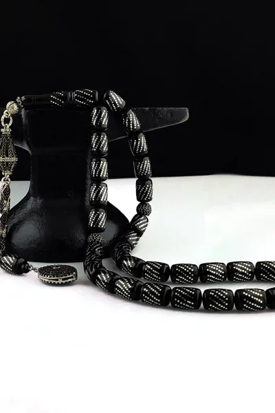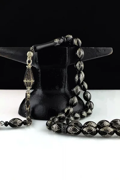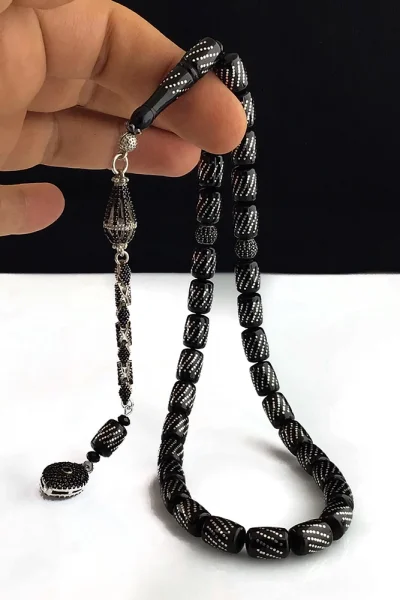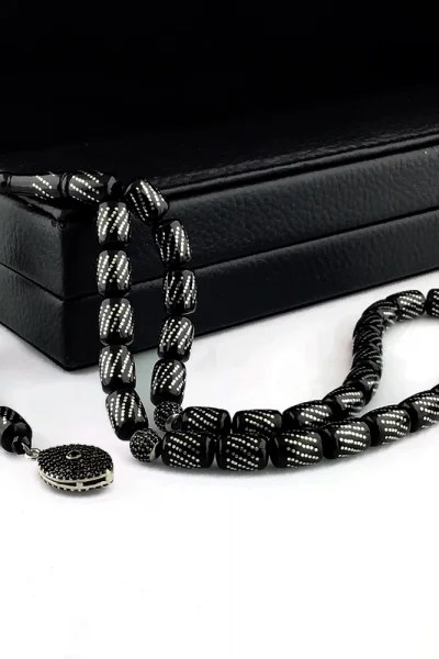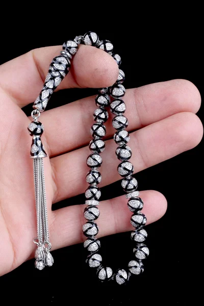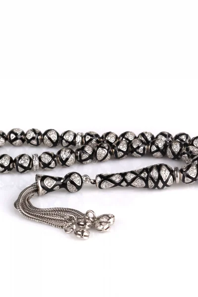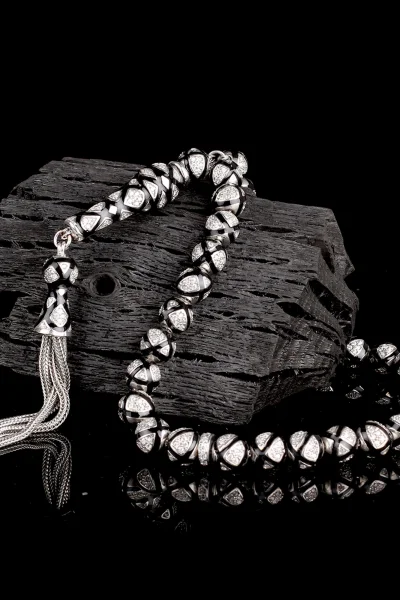 Zirkon Taşlı Siyah Mine İşlemeli Özel Tasarım 925 Ayar Gümüş Tesbih