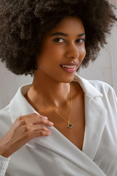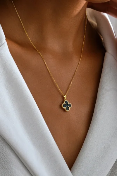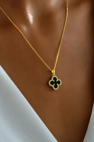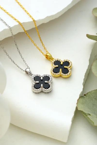 925 Ayar Gümüş Şans Sembolü Siyah Taşlı Yonca Kolye