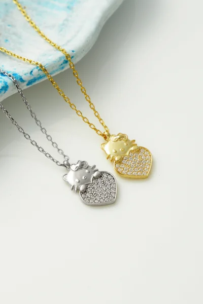 925 Ayar Gümüş Sevimli Kalpli Kedi Kolye